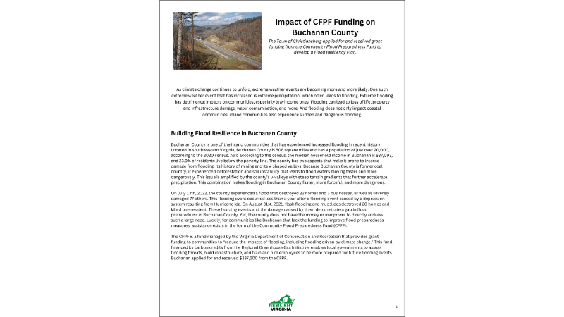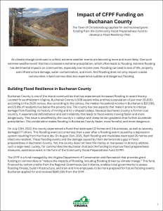 Buchanan County is one of the inland communities that has experienced increased flooding in recent history. After severe flooding in 2021 and 2022, Buchanan County applied for and received grant funding from the Community Flood Preparedness Fund to develop a Flood Resiliency Plan. This report looks at the progress Buchanan County is making towards developing this plan and the impact it is having on the community.