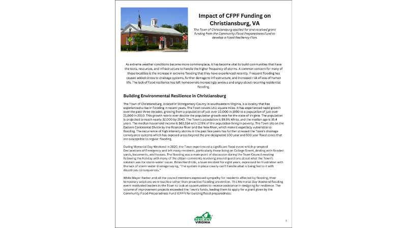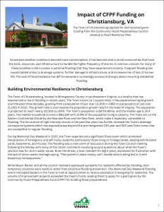 The Town of Christiansburg is one of the many communities in Virginia that has experienced a rise in flooding over the years. Because the volume of improvement projects necessary to take care of the impacts of this flooding exceeds the Town’s funds, they applied for and received a Community Flood Preparedness Fund (CFPF) grant for building flood preparedness. Through this grant, they are developing a Flood Resiliency Plan. This report looks at the progress Christiansburg is making towards developing this plan and the impact it is having on the community.
